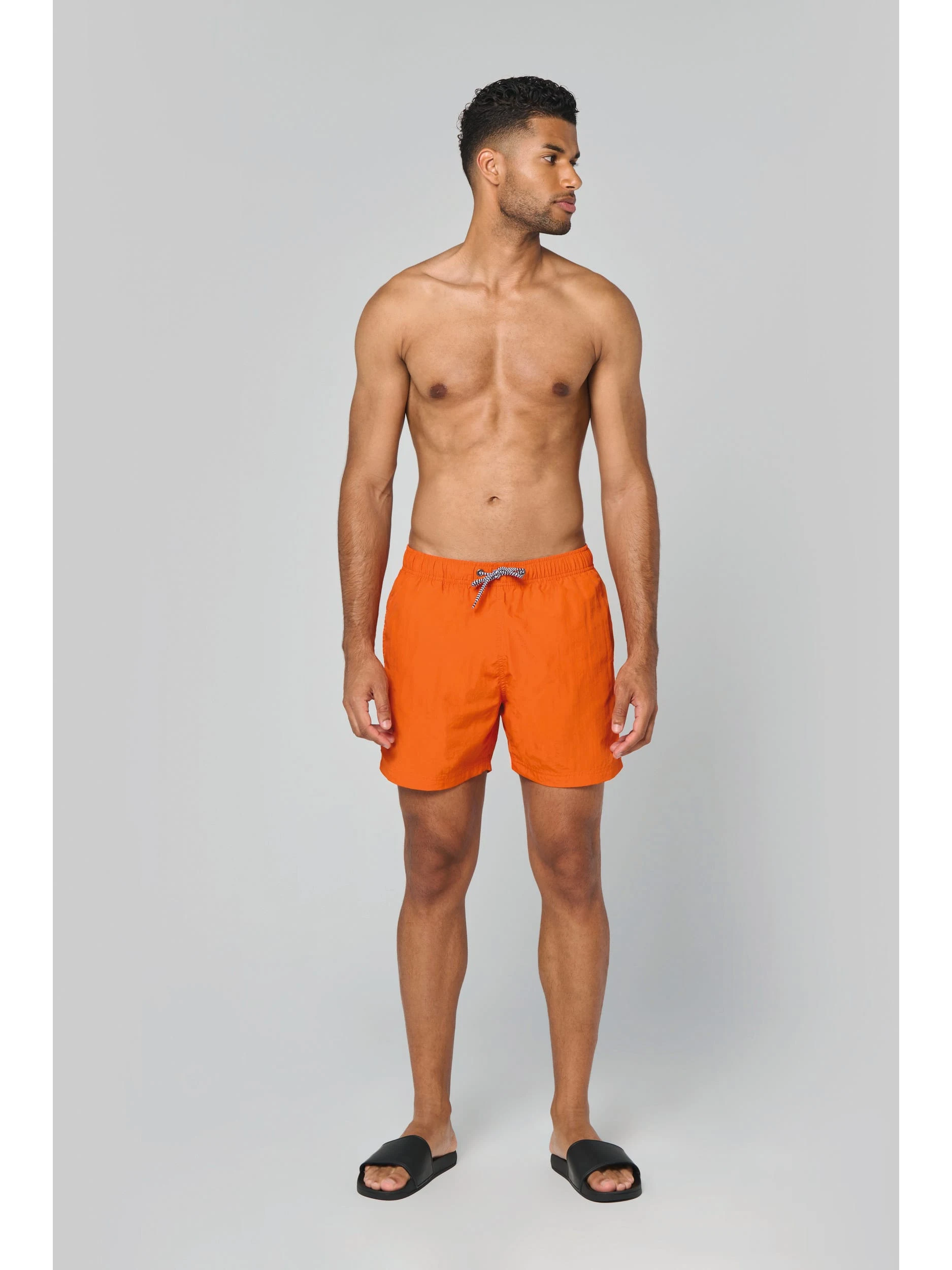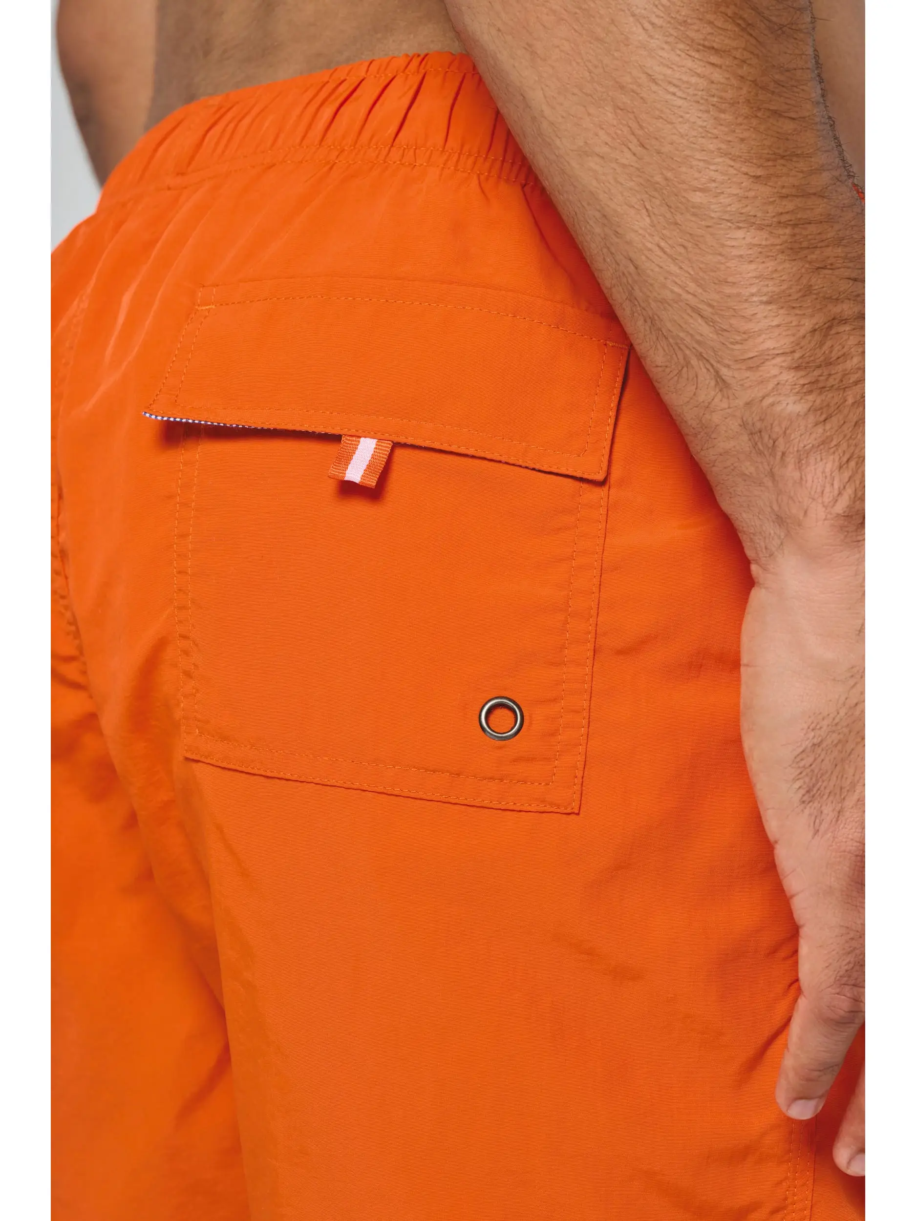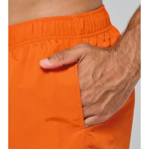 Extérieur : 100% polyamide 105g/m². Slip intégré en maille filet 100% polyester 65g/m². Doublure ceinture polycoton 80g/m². Tissu léger. Coupe mode. 2 poches latérales et 1 poche arrière avec oeillet, rabat et bande auto-agrippante. Ceinture intérieure fantaisie et élastiquée avec cordon de serrage.