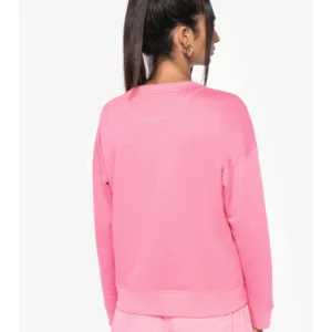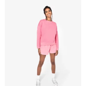 70% coton biologique / 30% modal TENCEL™. Coton peigné ringspun. Coupe oversize avec épaules tombantes. Bord côte col 2 x 2. Bord côte 1 x 1 bas de vêtement et bas de manches. 1/2 lune au dos. Pointe de courtoisie en V au col. Flatlock à cheval sur encolure, bas de manches et bas de vêtement. Bande de propreté intérieure en chevrons. TENCEL™ est une marque de Lenzing AG.