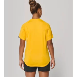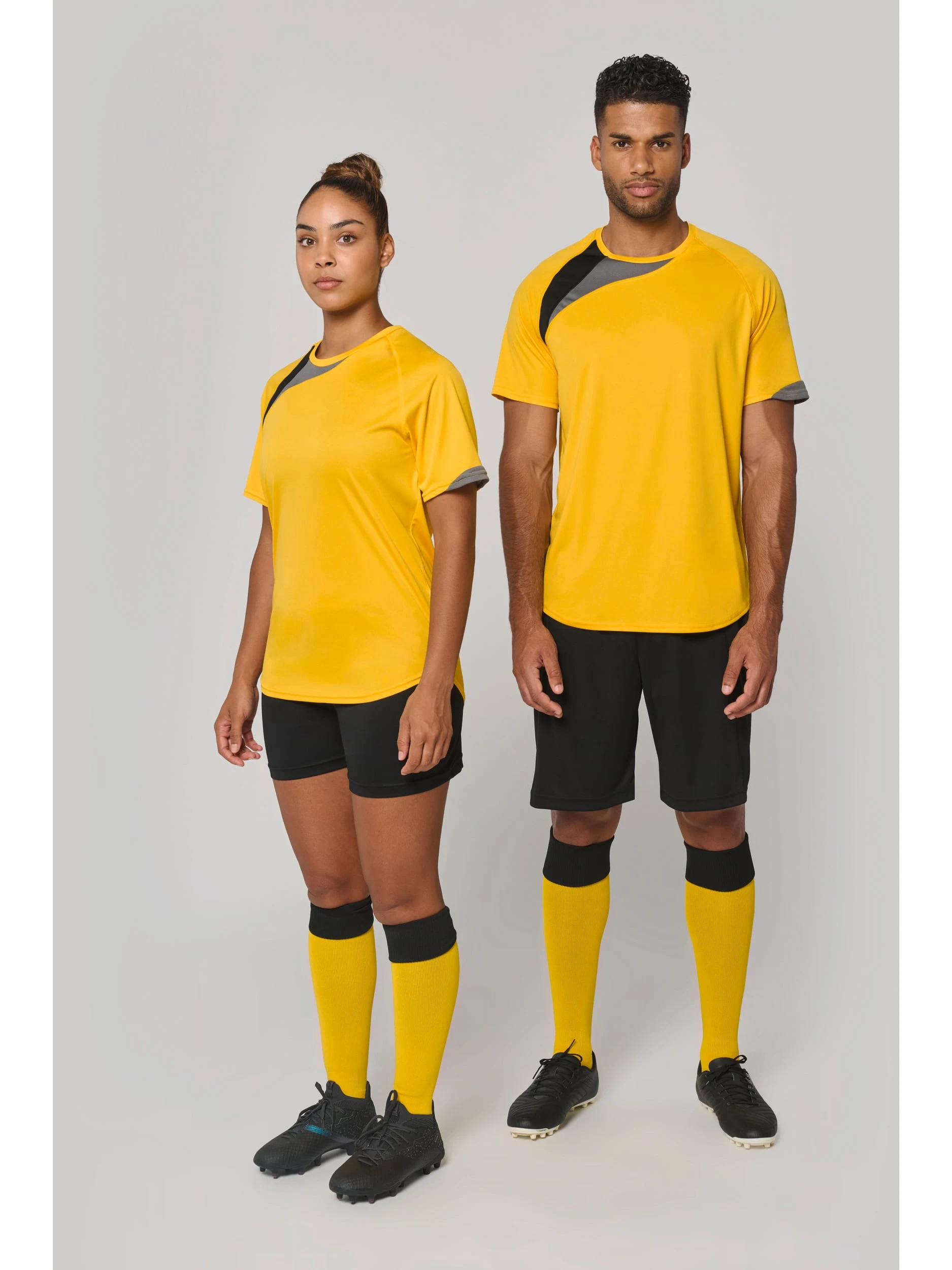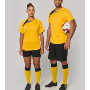100% polyester. Empiècements contrastés. Finition points de recouvrement ton sur ton. Finition double aiguille au bas de vêtement et manches.