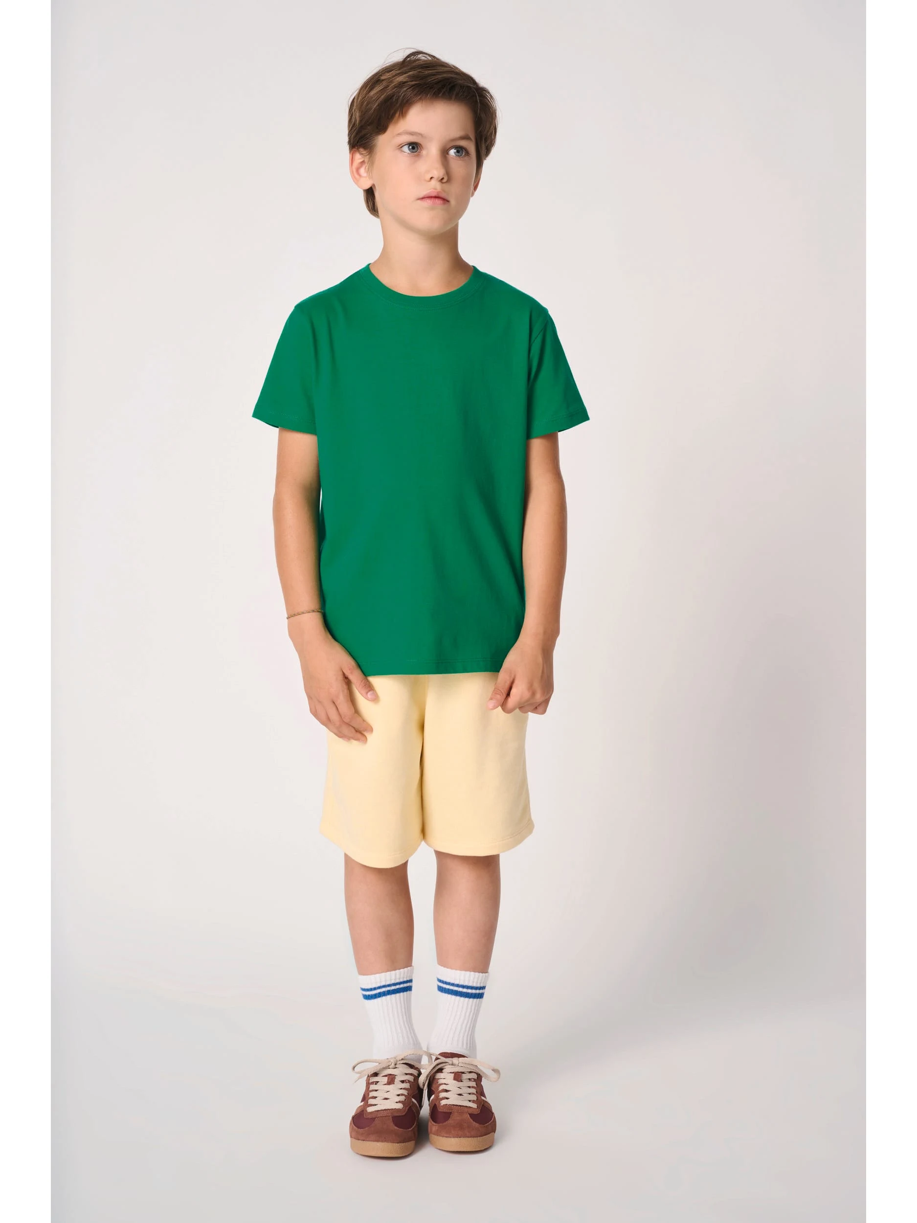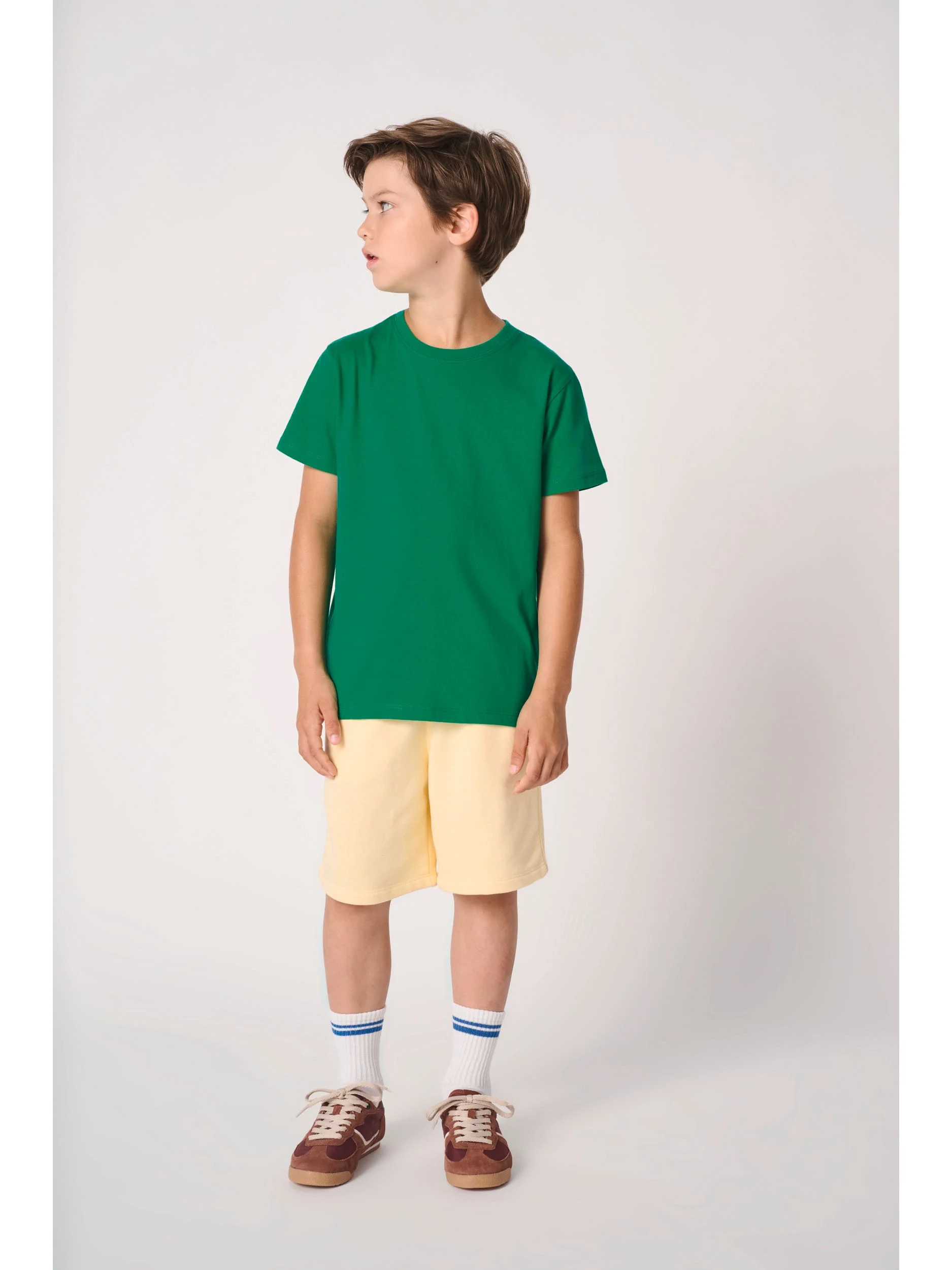 Coloris unis : 100% coton. Coloris Ideal Ash Heather : 99% coton / 1% viscose. Coloris Ideal Oxford Grey : 90% coton / 10% viscose. Coupe droite. Maille jersey coupé-cousu de la taille 1/2 jusqu’à 6/8 et tubulaire de la taille 8/10 jusqu’à 12/14. Col rond finition bord côte 1×1 avec double surpiqûres. Bande de propreté intérieure col ton sur ton. Finition double aiguilles bas de manches et bas de vêtement. Etiquette de marque détachable.