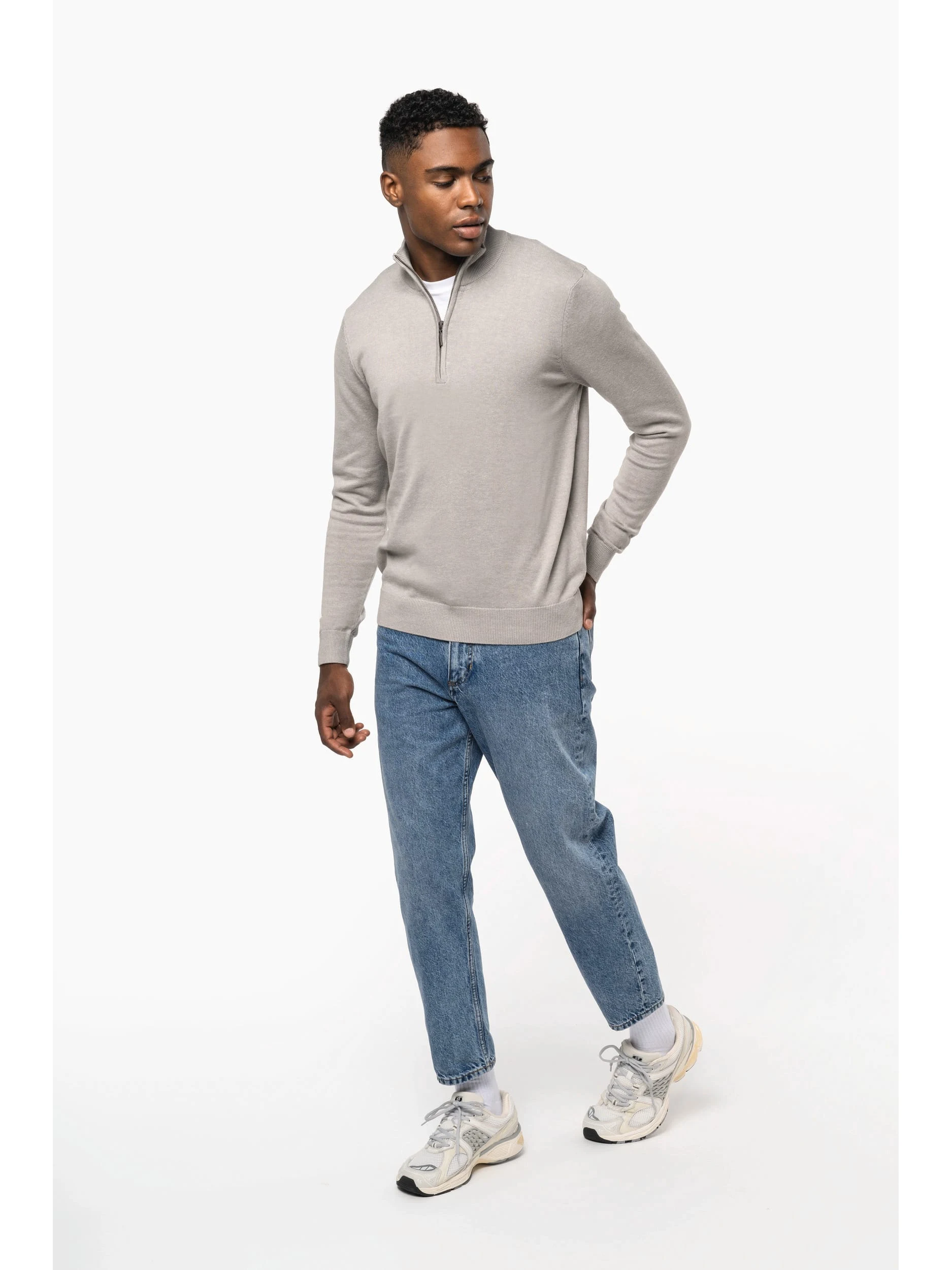 50% coton / 50% acrylique (jauge 12). Coupe droite. Col cheminée double épaisseur et fermeture avec zip métal fumé. Bande de propreté à l’encolure.