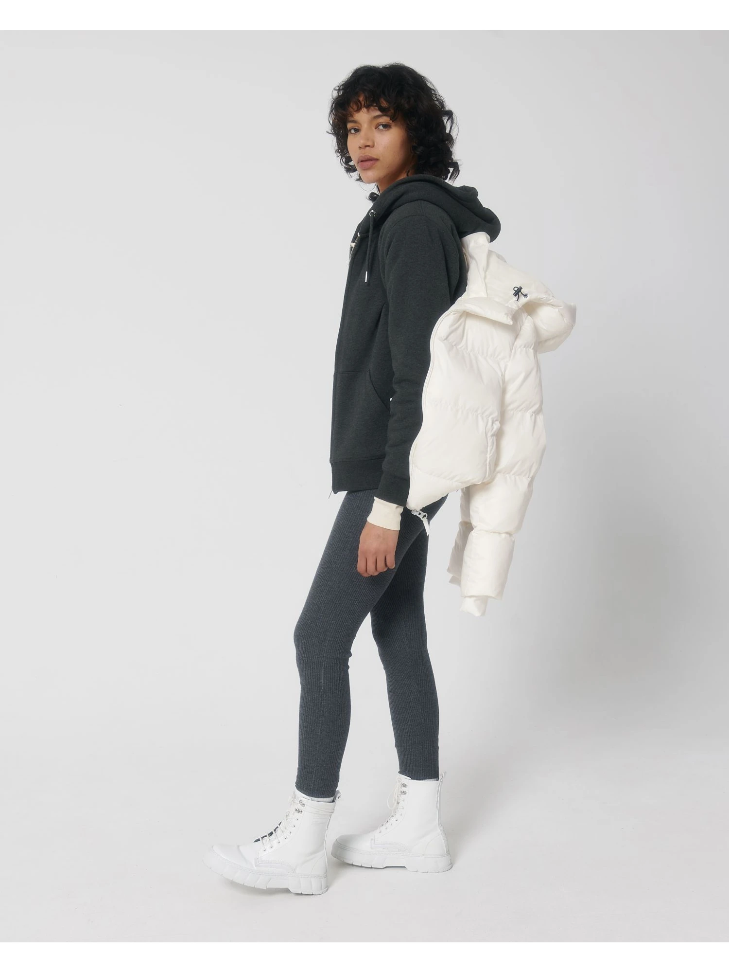 Capuche doublée Zip nylon milieu devant avec protège-menton Manches montées Poches passepoilées zippées avec tirettes en gros-grain Côte 1×1 au bas de manches Bas de corps élastiqué Ouverture de la capuche ajustable avec cordon élastique et stoppeurs en plastique Demi-lune dans la matière principale au dos du col Poche intérieure poitrine zippée Sangles intérieures en gros-grain pour un port polyvalent (bretelles) Zip intérieur invisible côté cœur et au bas de corps pour un accès facile à la décoration