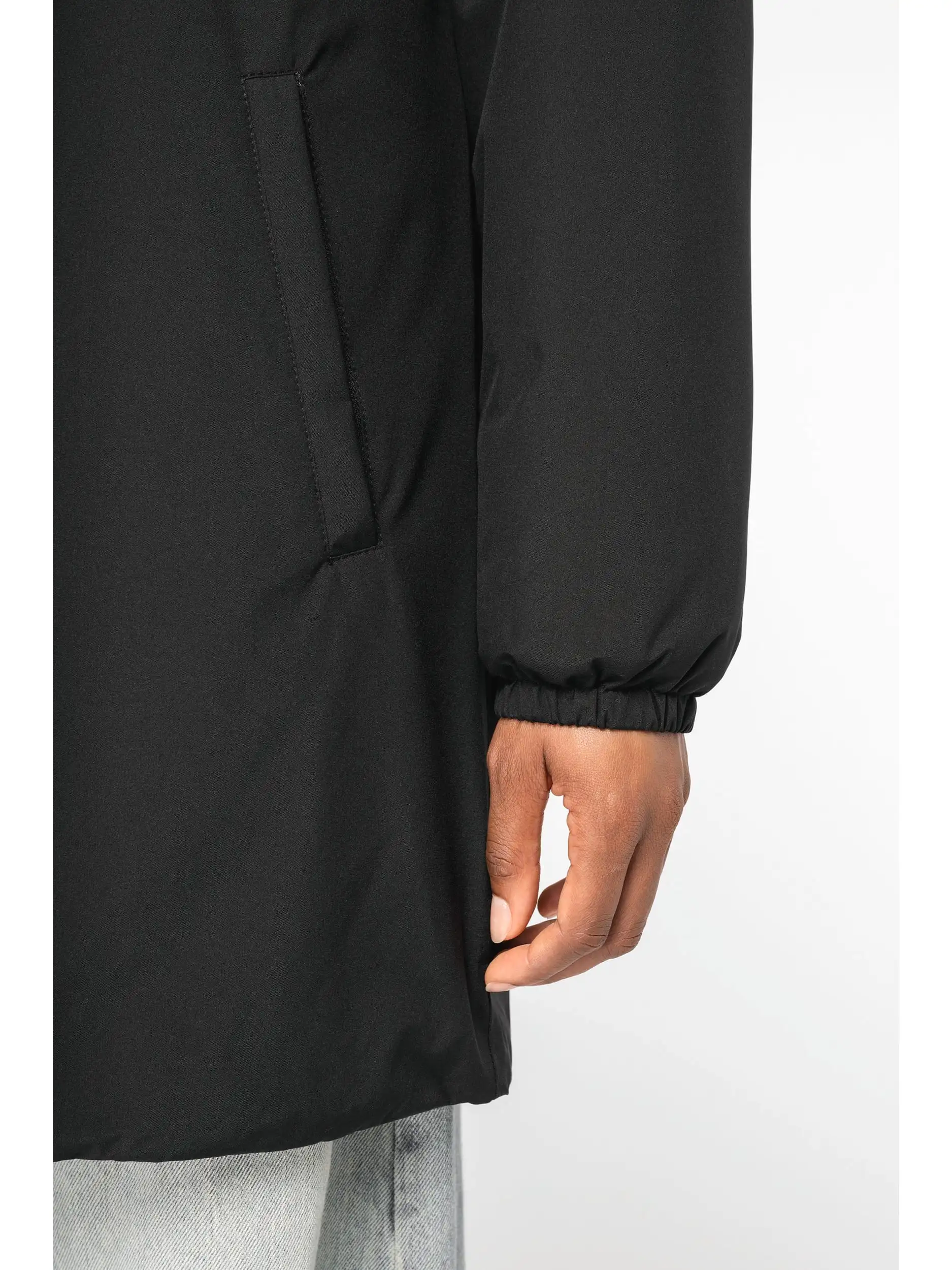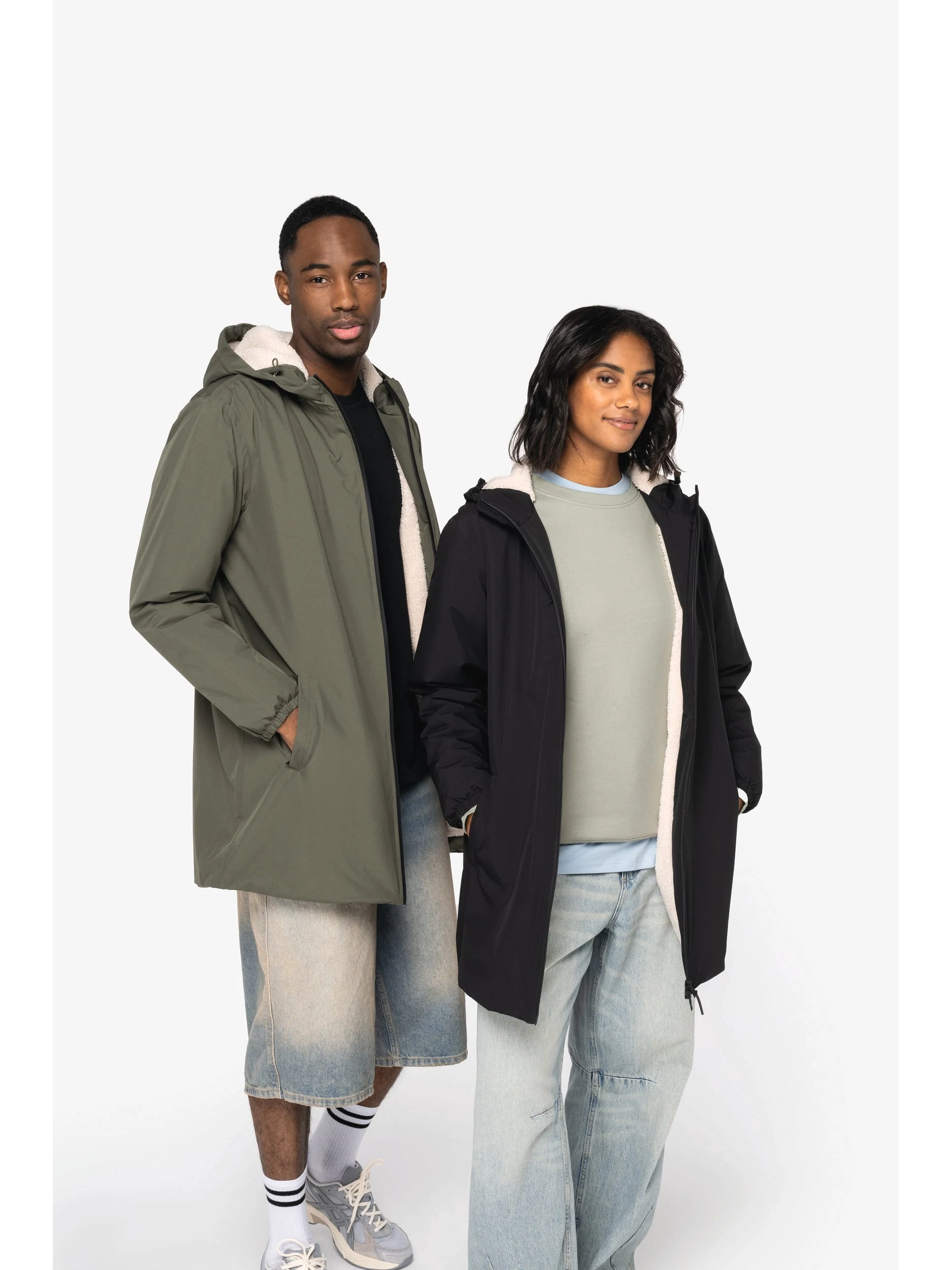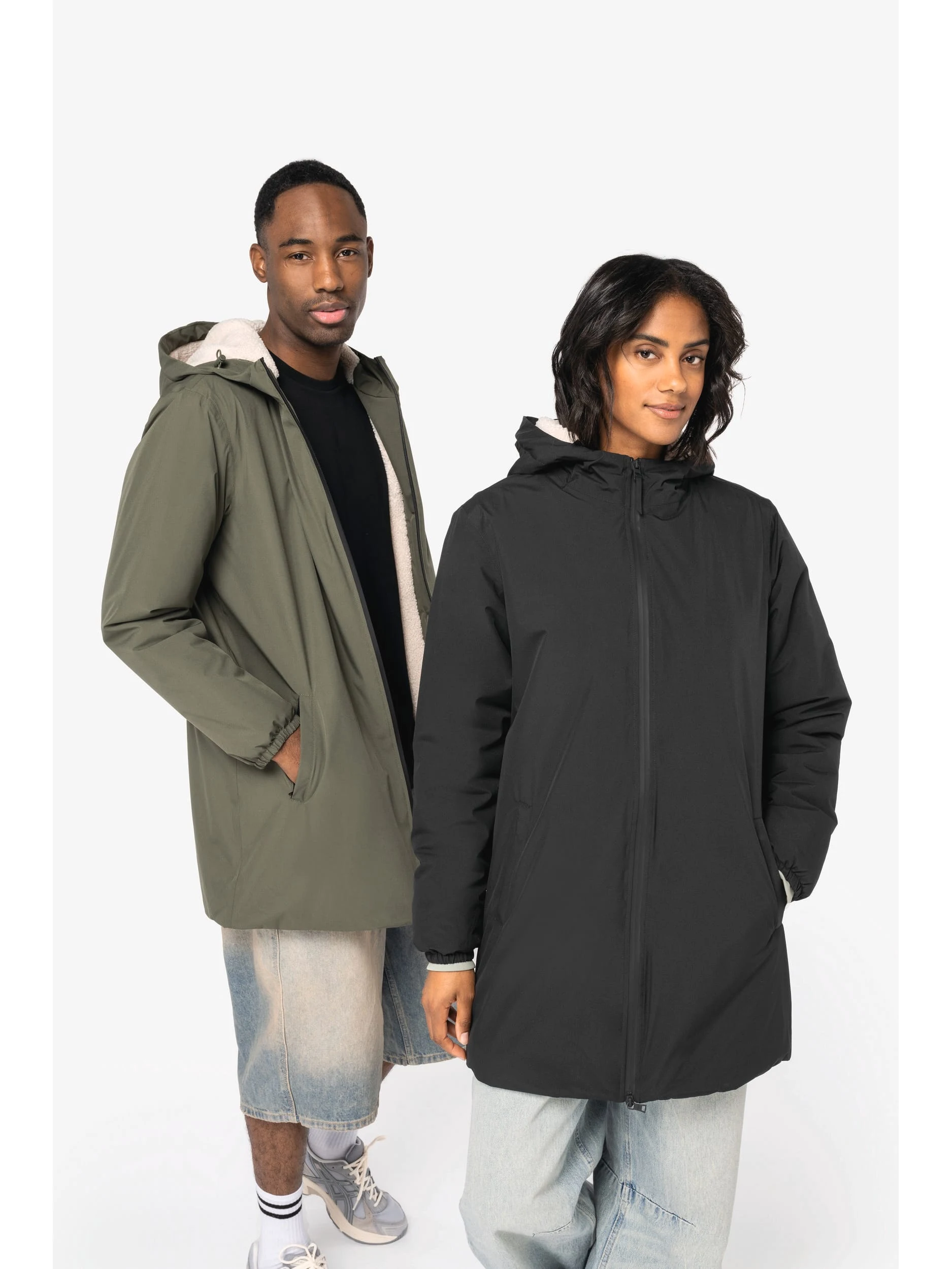 100% polyester recyclé post-consumer. Coupe standard. Imperméable 4000mm. Respirant 3000 g/m²/24h. Produit doublé en sherpa écru sur toutes les couleurs, capuche et corps. Manches doublées en taffetas 210T écru sur toutes les couleurs et rembourrées. Zip imperméable recyclé avec double tire-zip en métal recyclé. Parmenture en finition intérieure en tissu principal. Deux poches côtés passepoilées avec zip inversé. Capuche 3 panneaux avec cordon de serrage et stoppeurs recyclés intérieurs. Bas de manches élastiqués. Poche passepoilée intérieure côté cœur. Patch de personnalisation intérieur en tissu principal. Zip de personnalisation poitrine et bas de vêtement. Tissu avec membrane intérieure et coutures thermo soudées permettant au produit d’être imperméable.