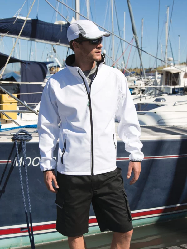 Tissu extensible 2 couches, fils texturés, avec couche extérieure 100% polyester et couche intérieure 100% polyester micropolaire. Résistant à l’eau, respirant et coupe-vent. Surpiqûre décorative. Fermeture zippée YKK à l’avant avec protège-menton. Poches latérales zippées. Poignets élastiqués. Étiquette détachable. Coupe ajustée. Lavage à 60°C.